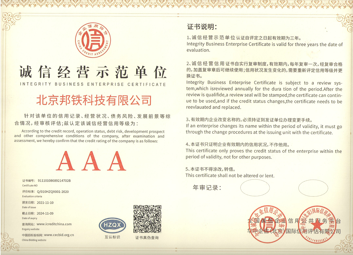 誠信經營示范單位-AAA證書