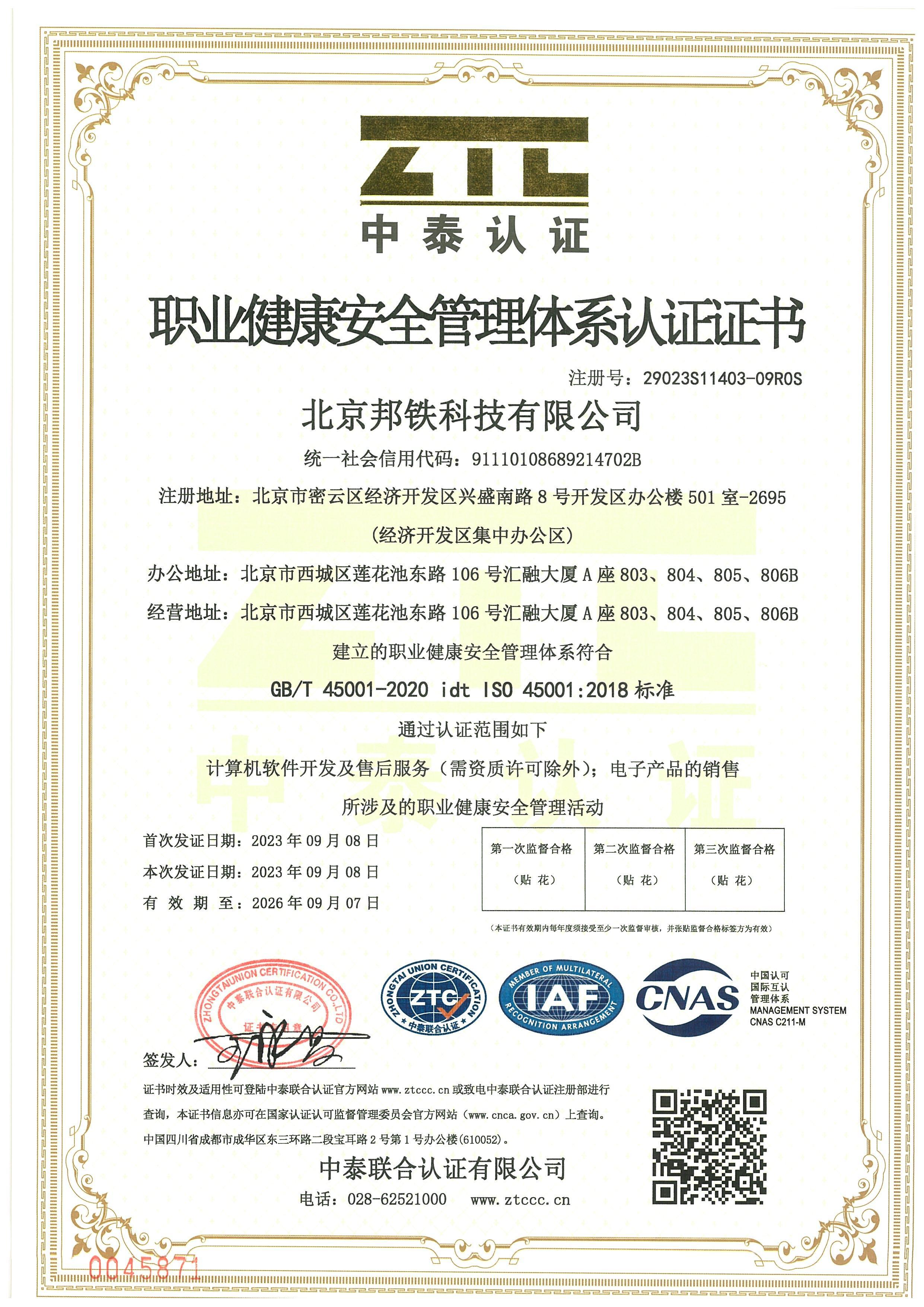 職業健康安全管理體系認證證書